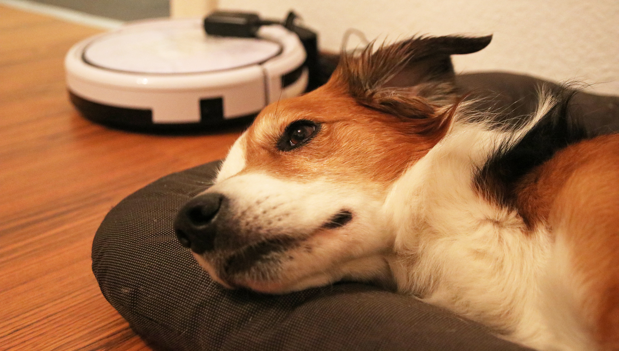 | Klimt und Robi, der Staubsaugerroboter, laden ihre Akkus auf. |